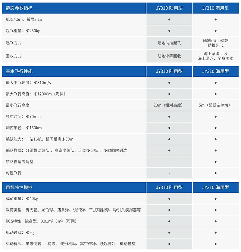 JY-310型靶机是一款高亚声速大机动能力高性能隐身靶机,具有北斗/惯性组合导航精确航路控制,多机协同飞行控制,水平及高低大机动等飞行能力,可选装多频微波源,干扰机,诱饵弹,箔条弹,龙伯球,曳光管等多种任务载荷,可模拟三四代战机,巡航弹及反舰武器的目标特性,为部队训练及演习提供了高性能空中靶标。