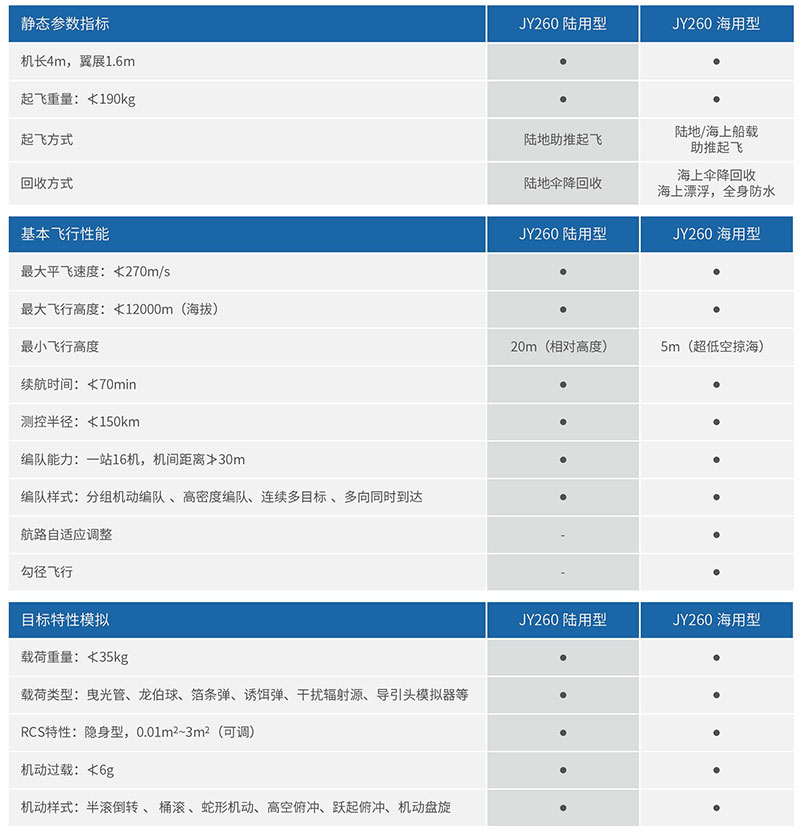 JY-260型靶机是一款具有大机动能力的隐身靶机,具有北斗/惯性组合导航精确航路控制,自适应小航路勾径控制,多机协同行控制,水平及高低大机动等行能力,可选装多频微波源,干扰机,诱饵弹,箔条弹,龙伯球,曳光管等多种任务载荷,可模拟三四代战机,巡航弹及反舰武器的目标特性,为部队训练及演习提供了高性能机动隐身靶标。